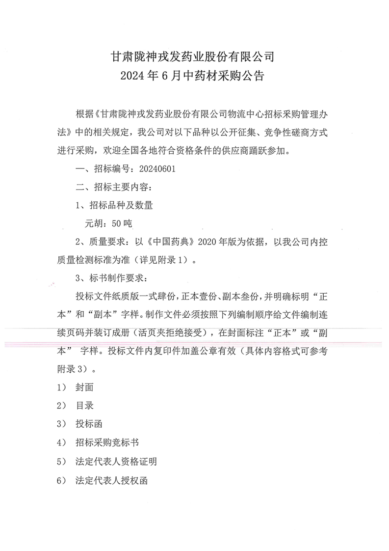 甘肅隴神戎發(fā)藥業(yè)股份有限公司2024年6月中藥材采購(gòu)公告