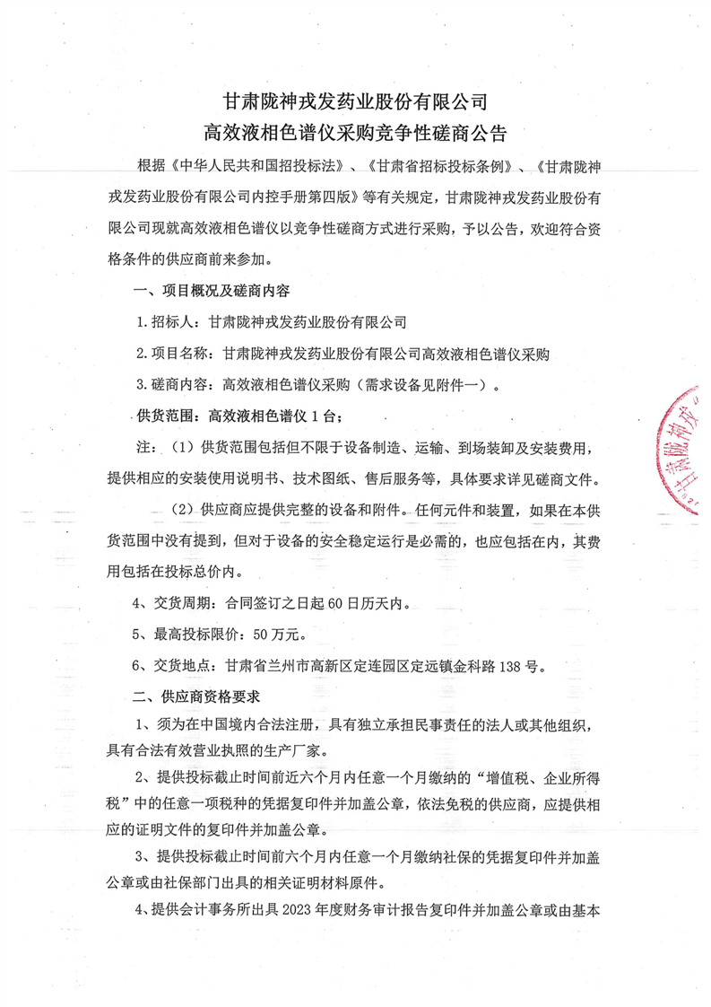 甘肅隴神戎發(fā)藥業(yè)股份有限公司高效液相色譜儀采購(gòu)競(jìng)爭(zhēng)性磋商公告