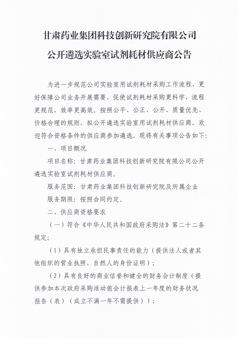 甘肅藥業(yè)集團(tuán)科技創(chuàng)新研究院有限公司公開遴選實(shí)驗(yàn)室試劑耗材供應(yīng)商公告