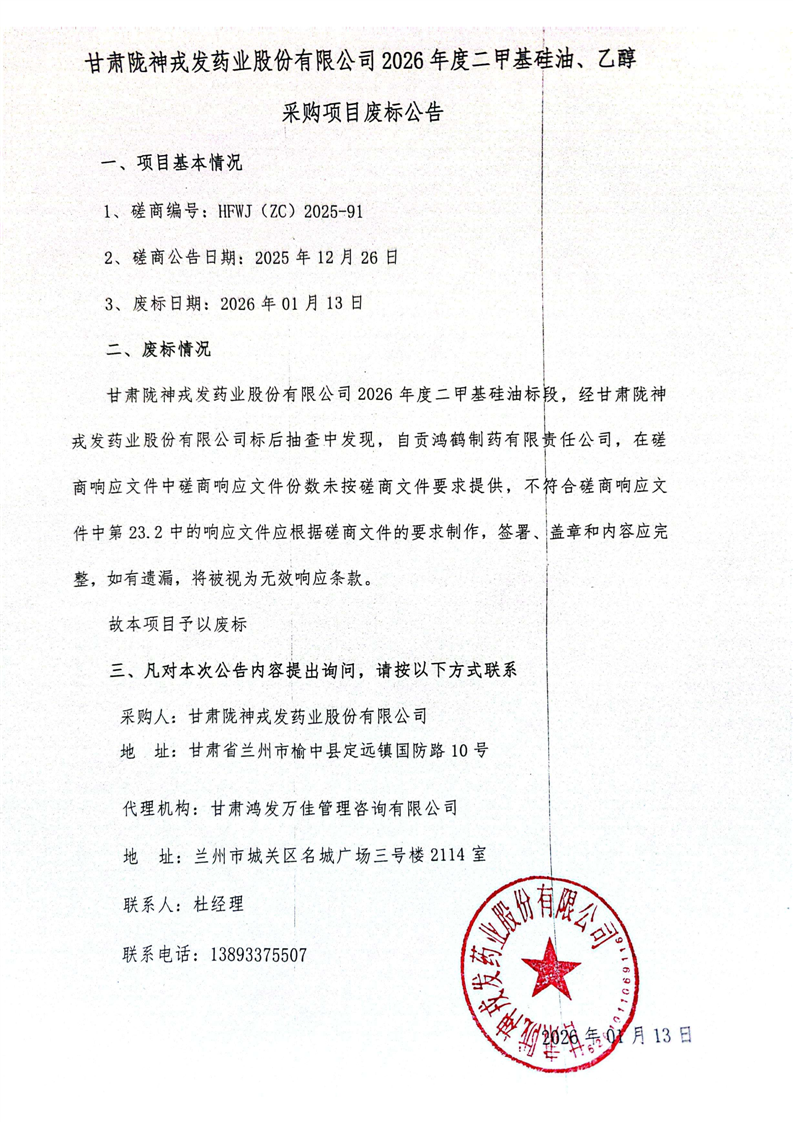甘肅隴神戎發(fā)藥業(yè)股份有限公司2026年度二甲基硅油、乙醇采購(gòu)項(xiàng)目廢標(biāo)公告