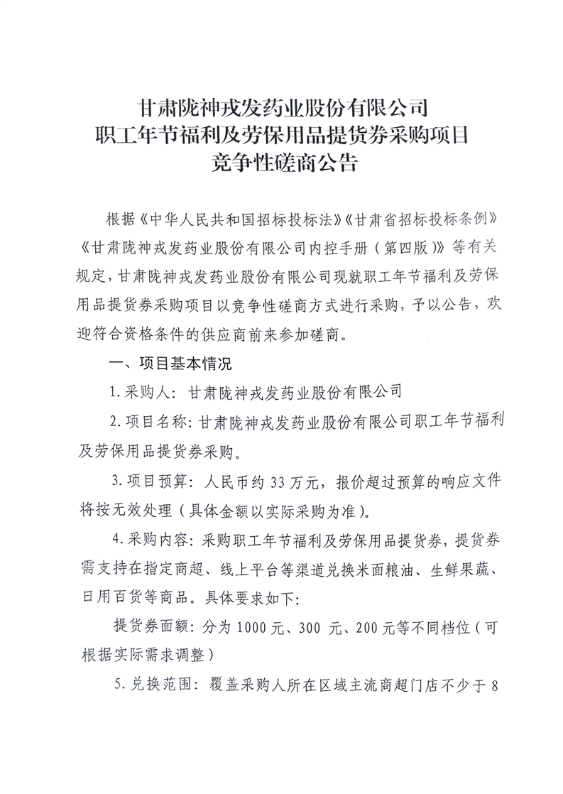 甘肅隴神戎發(fā)藥業(yè)股份有限公司職工年節(jié)福利及勞保用品提貨券采購(gòu)項(xiàng)目競(jìng)爭(zhēng)性磋商公告