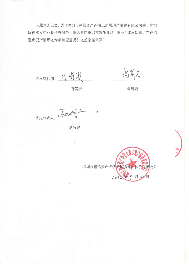 深圳鵬信資產(chǎn)評估公司關(guān)于上市公司重大資產(chǎn)重組前發(fā)生業(yè)績變臉或本次重組存在擬置出資產(chǎn)情形之專項核查意見