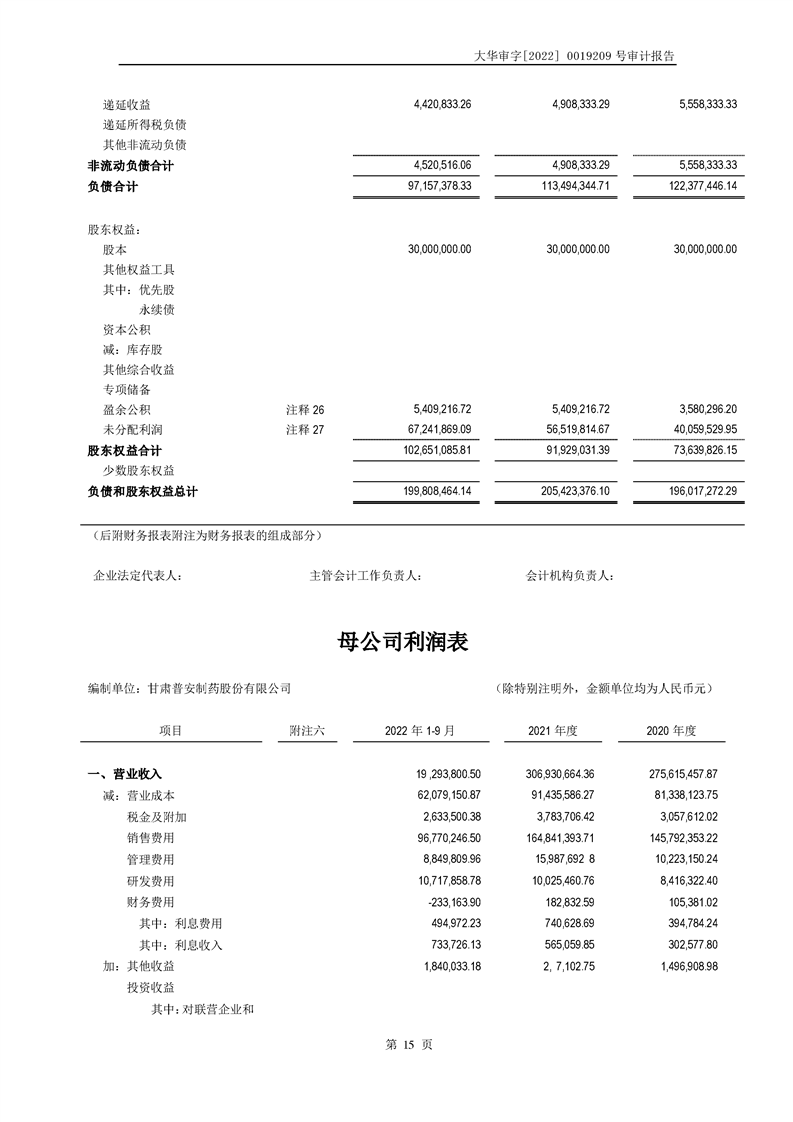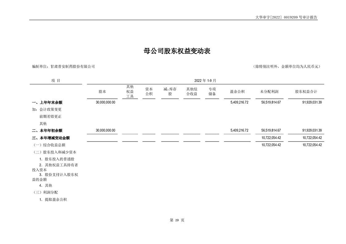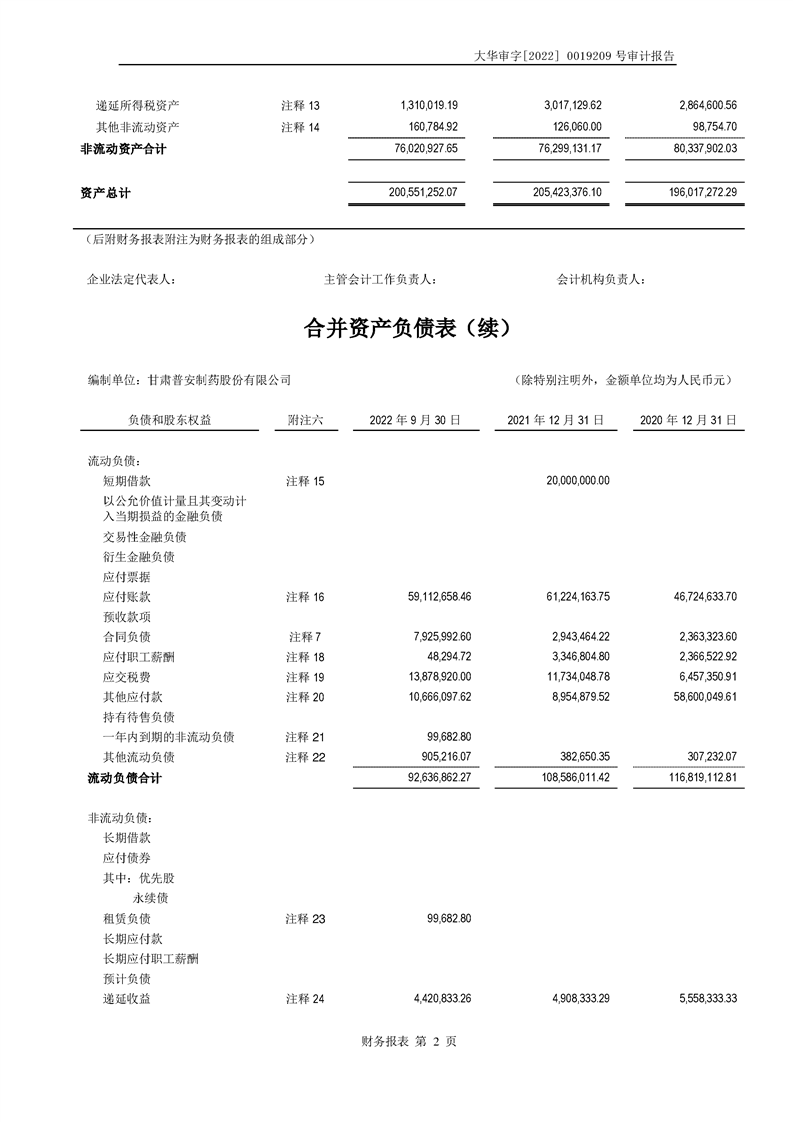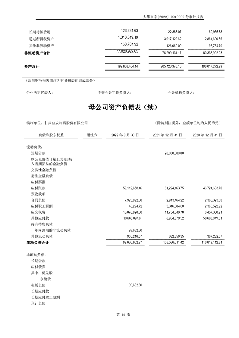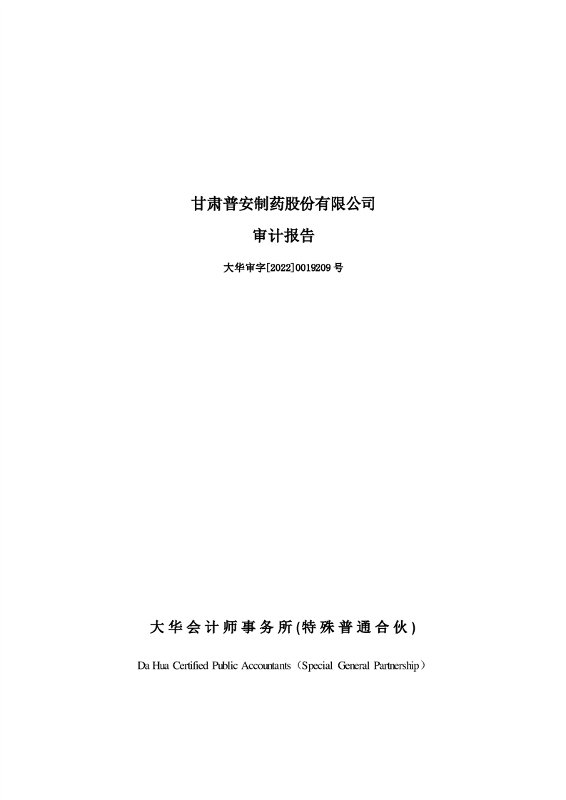 甘肅普安制藥股份有限公司審計報告-大華審字[2022]0019209號