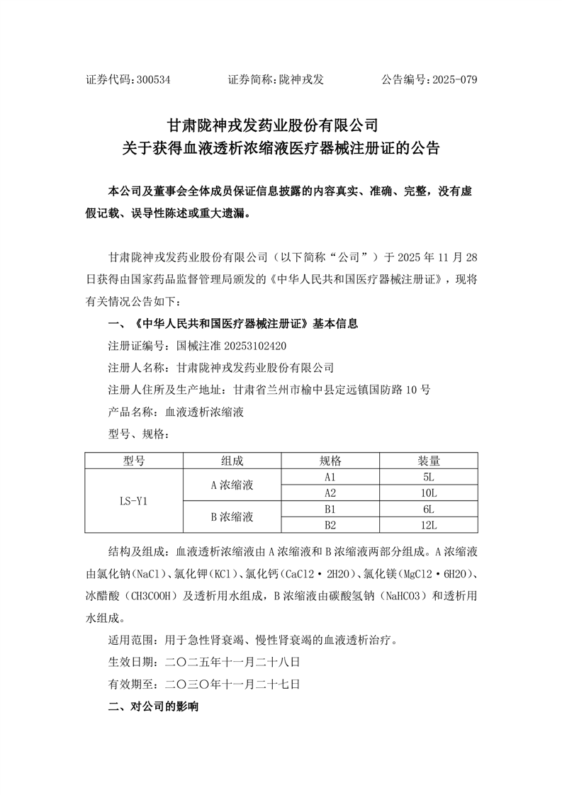 關(guān)于獲得血液透析濃縮液醫(yī)療器械注冊(cè)證的公告