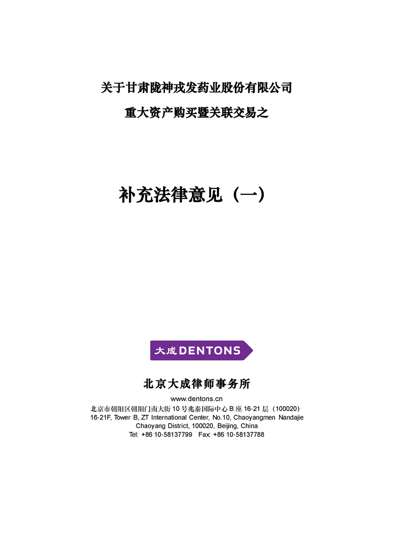 北京大成律師事務所關于甘肅隴神戎發(fā)藥業(yè)股份有限公司重大資產(chǎn)購買暨關聯(lián)交易補充法律意見(一)