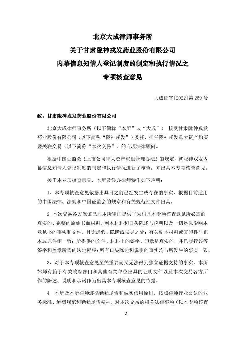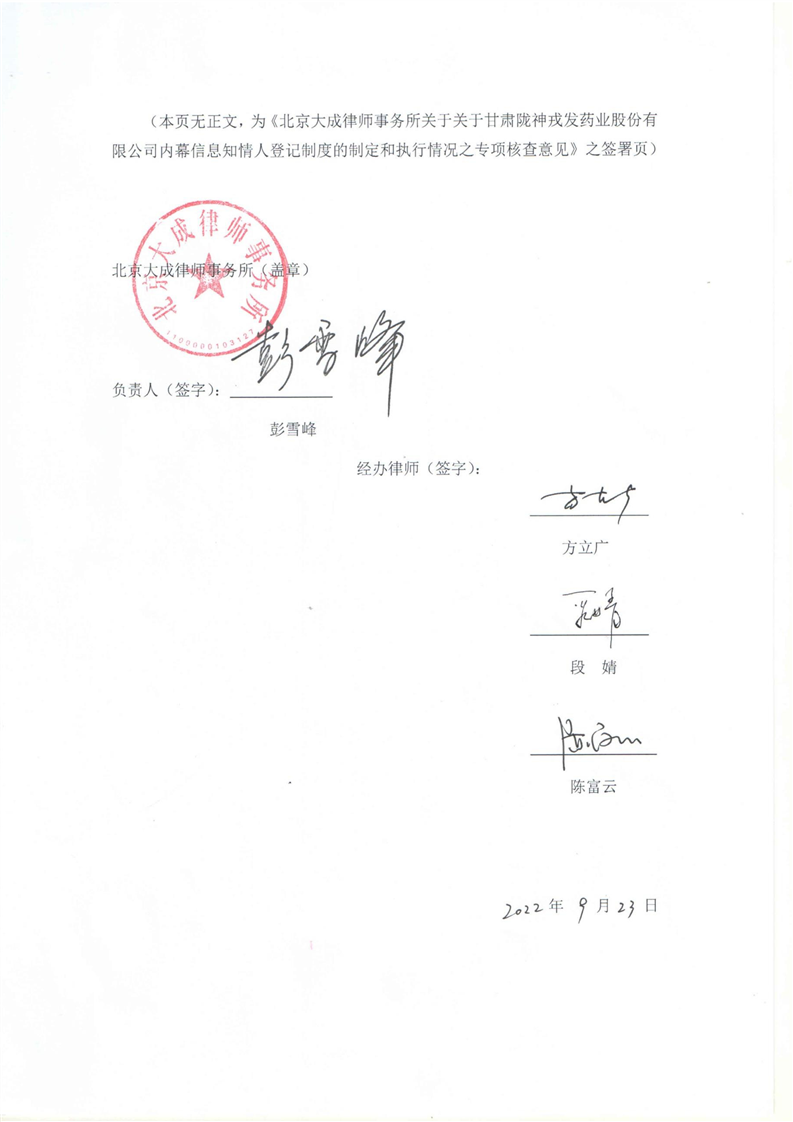 北京大成律師事務(wù)所關(guān)于隴神戎發(fā)內(nèi)幕信息知情人登記制度的制定和執(zhí)行情況專項(xiàng)核查意見