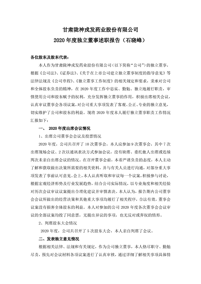 2020年獨(dú)立董事述職報(bào)告(石曉峰)