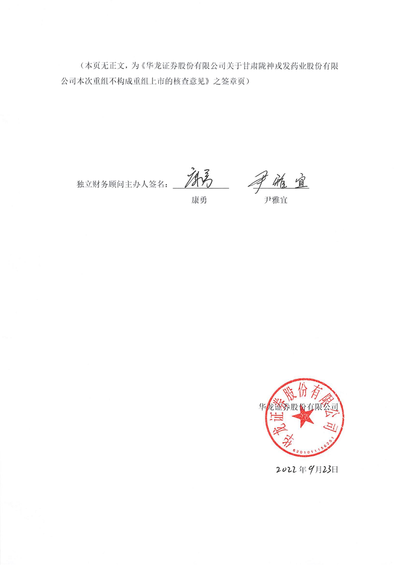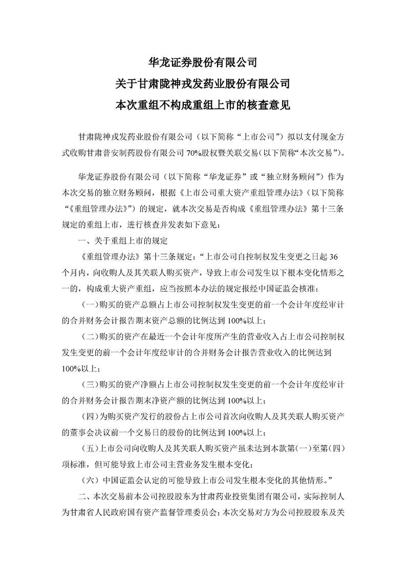華龍證券股份有限公司關(guān)于甘肅隴神戎發(fā)藥業(yè)股份有限公司本次重組不構(gòu)成重組上市的核查意見