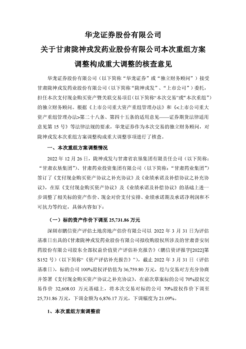 華龍證券股份有限公司關于甘肅隴神戎發(fā)藥業(yè)股份有限公司本次重組方案調(diào)整構(gòu)成重大調(diào)整的核查意見