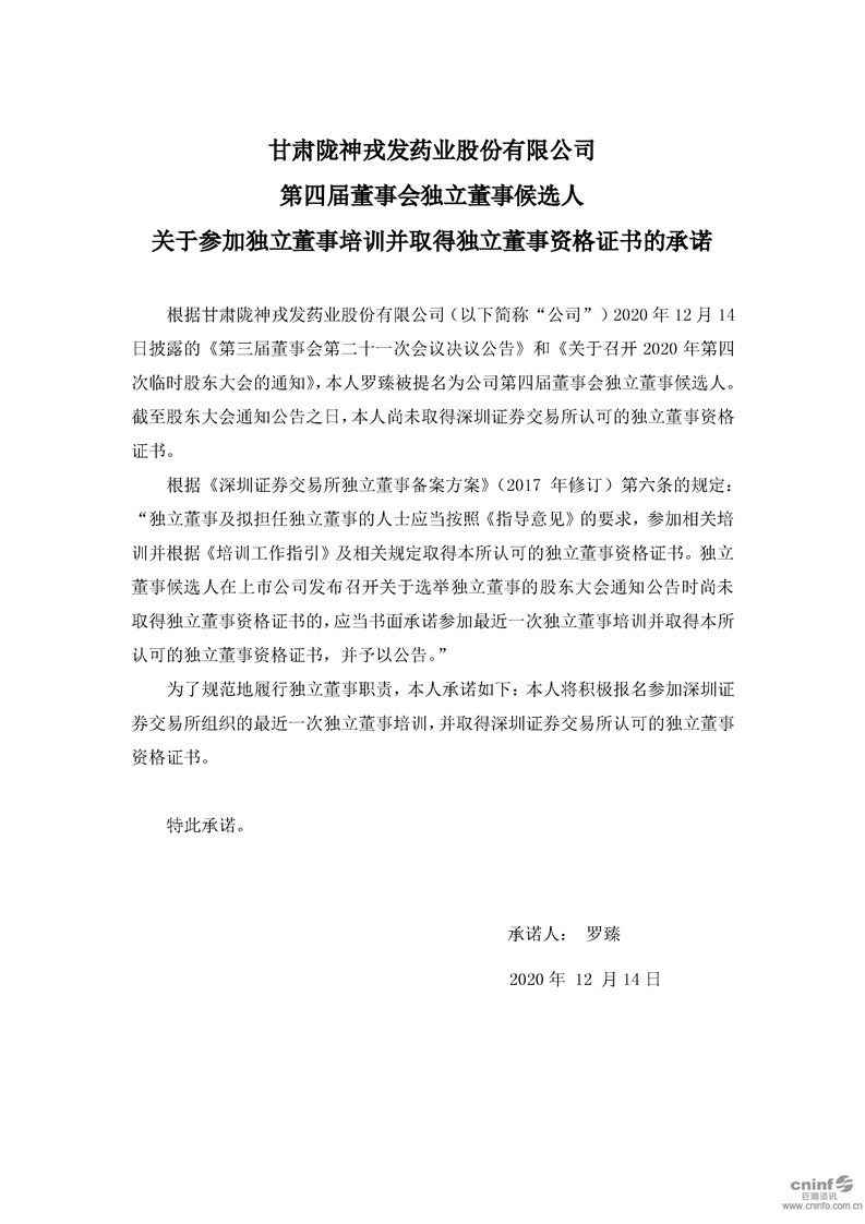 第四屆董事會(huì)獨(dú)立董事候選人關(guān)于參加獨(dú)立董事培訓(xùn)并取得獨(dú)立董事資格證書(shū)的承諾