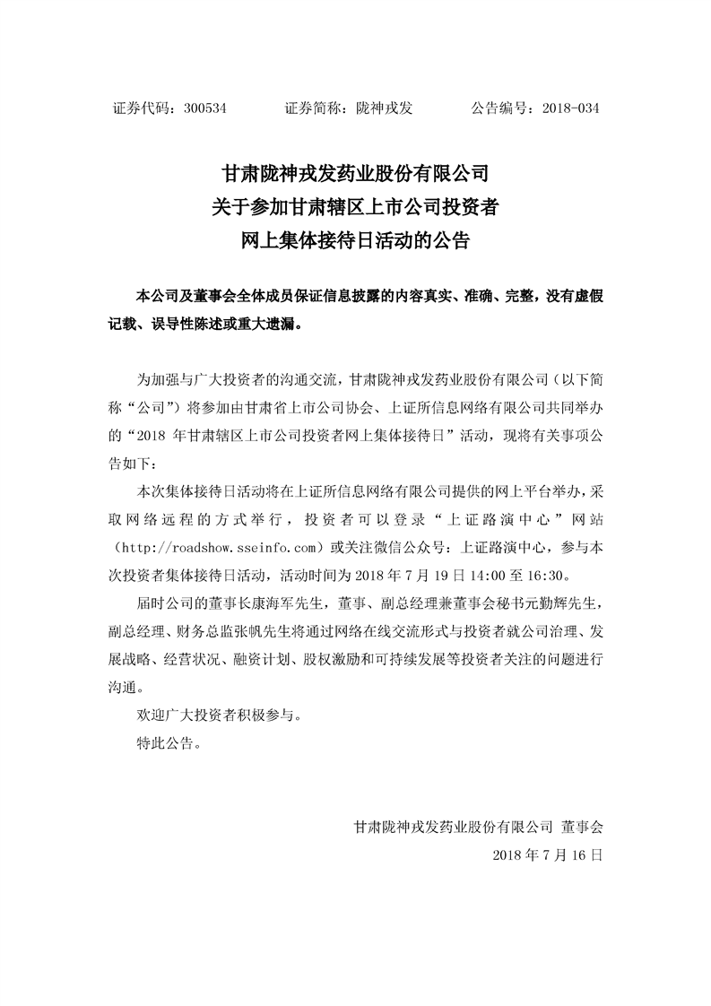 關(guān)于參加甘肅轄區(qū)上市公司投資者 網(wǎng)上集體接待日活動(dòng)的公告