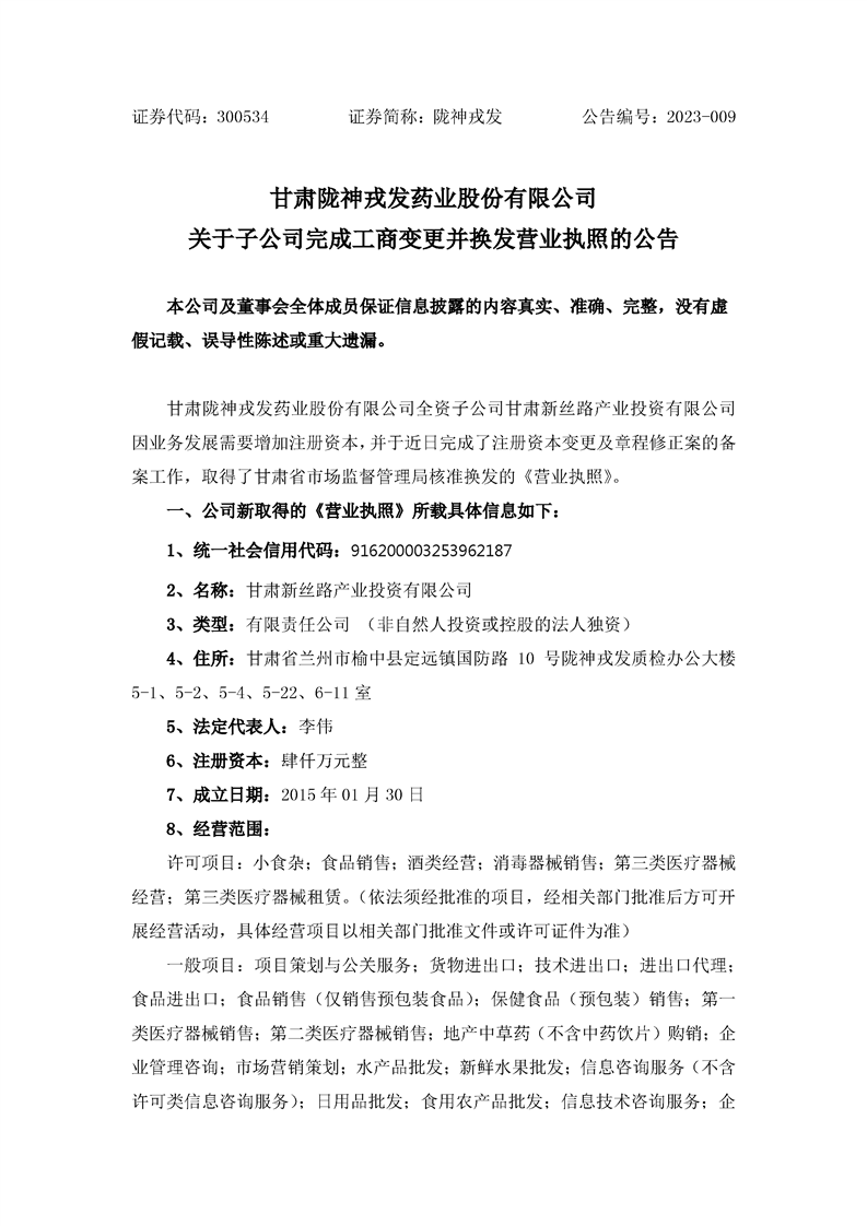 關(guān)于子公司完成工商變更并換發(fā)營業(yè)執(zhí)照的公告