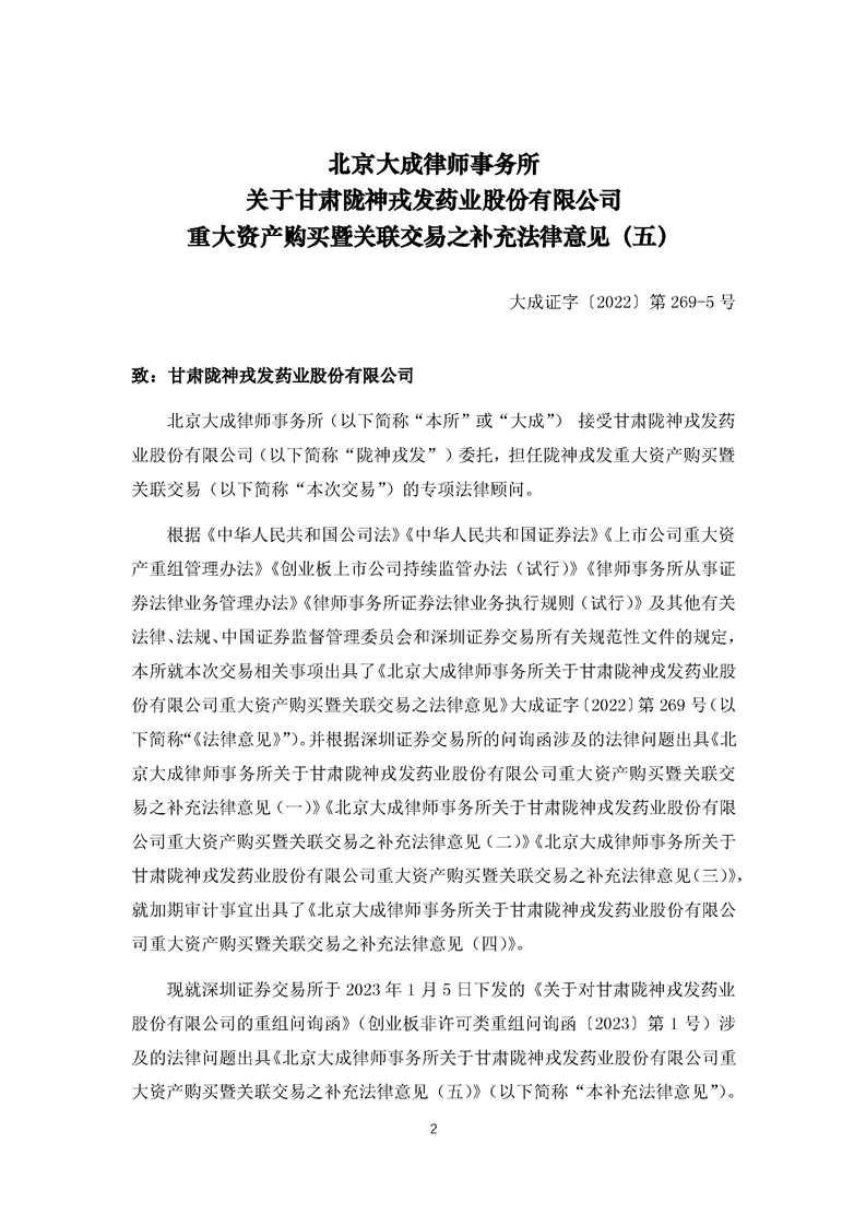 北京大成律師事務(wù)所關(guān)于甘肅隴神戎發(fā)藥業(yè)股份有限公司重大資產(chǎn)購(gòu)買暨關(guān)聯(lián)交易補(bǔ)充法律意見(jiàn)(五)