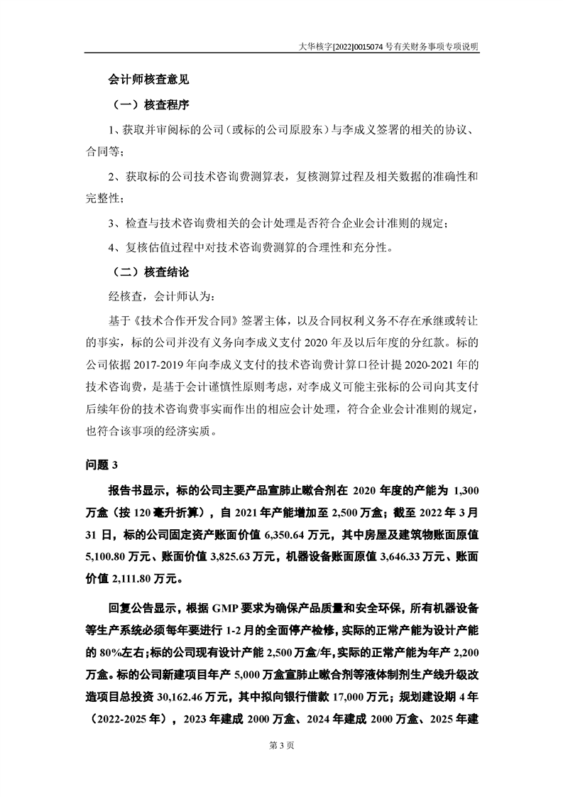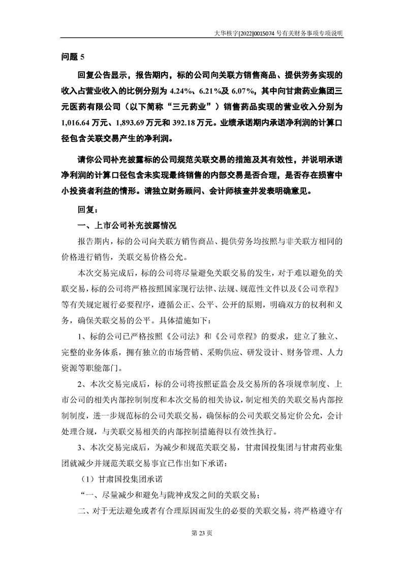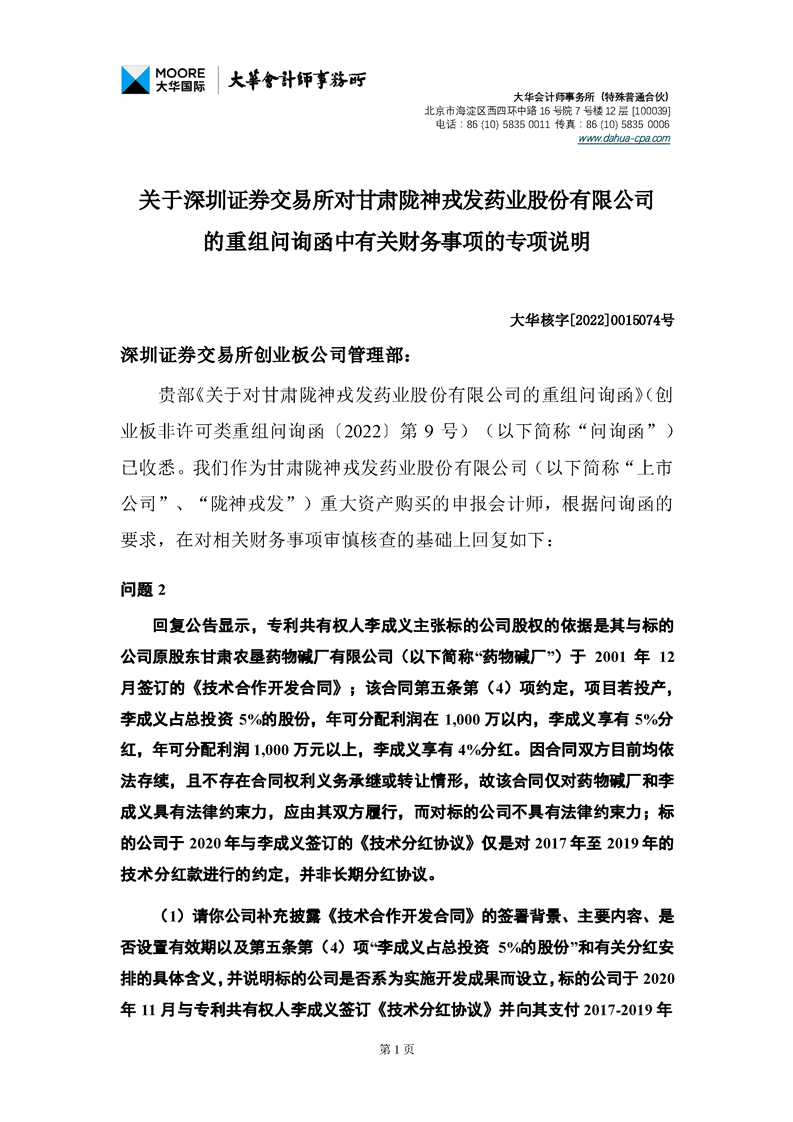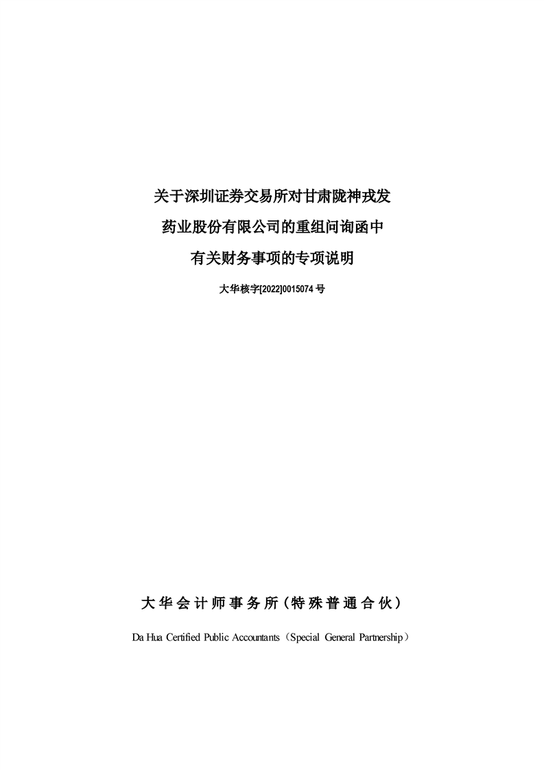關(guān)于深圳證券交易所對(duì)甘肅隴神戎發(fā)藥業(yè)股份有限公司的重組問(wèn)詢函中有關(guān)財(cái)務(wù)事項(xiàng)的專項(xiàng)說(shuō)明-大華核字[2022]0015074號(hào)