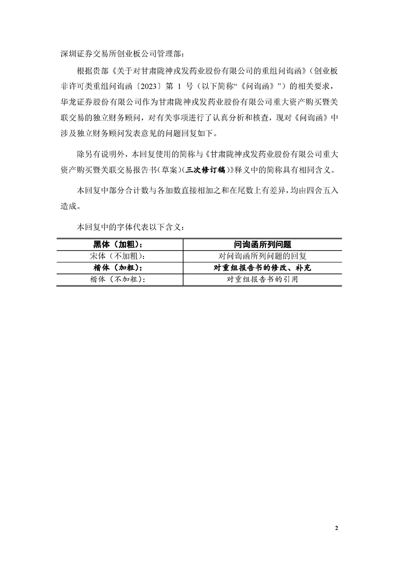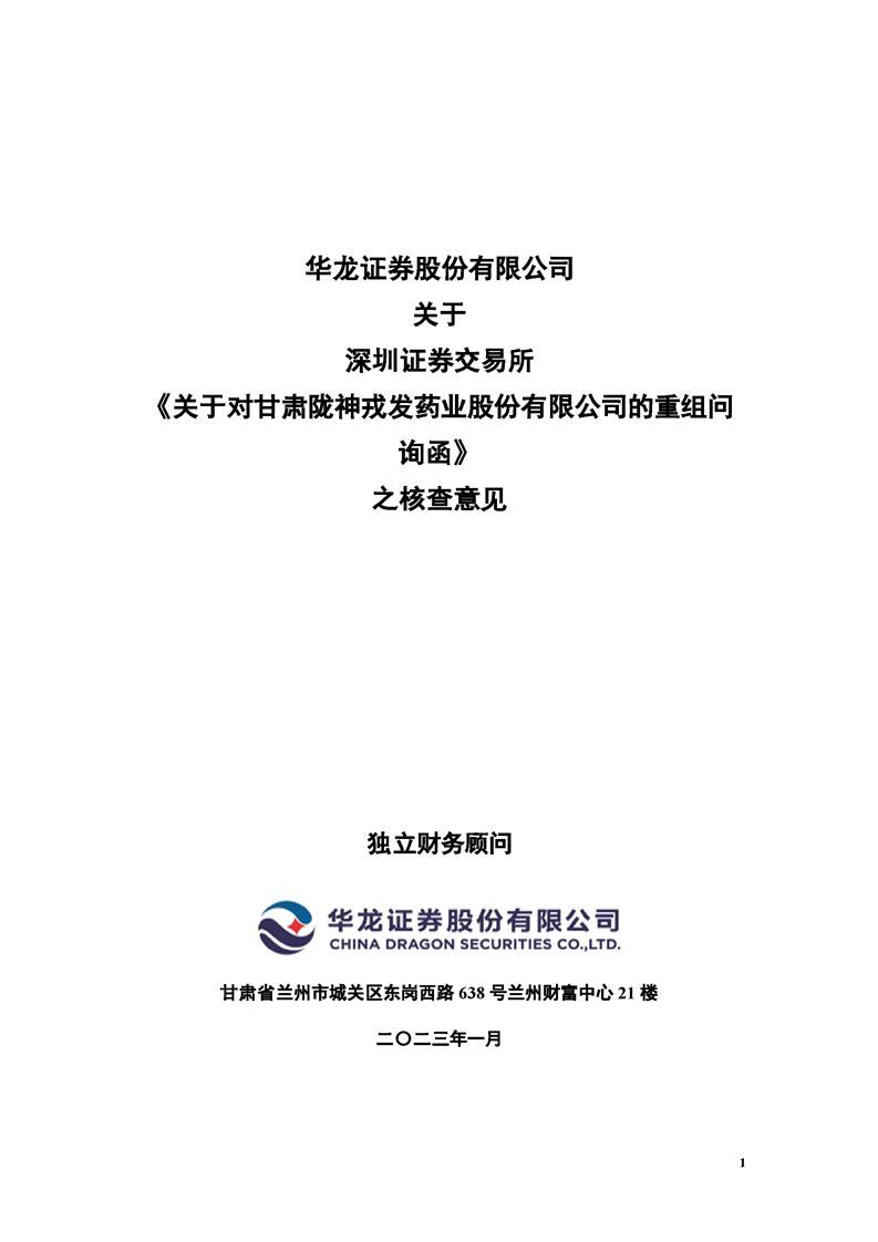 華龍證券股份有限公司關(guān)于深圳證券交易所《關(guān)于對(duì)甘肅隴神戎發(fā)藥業(yè)股份有限公司的重組問(wèn)詢函》之核查意見