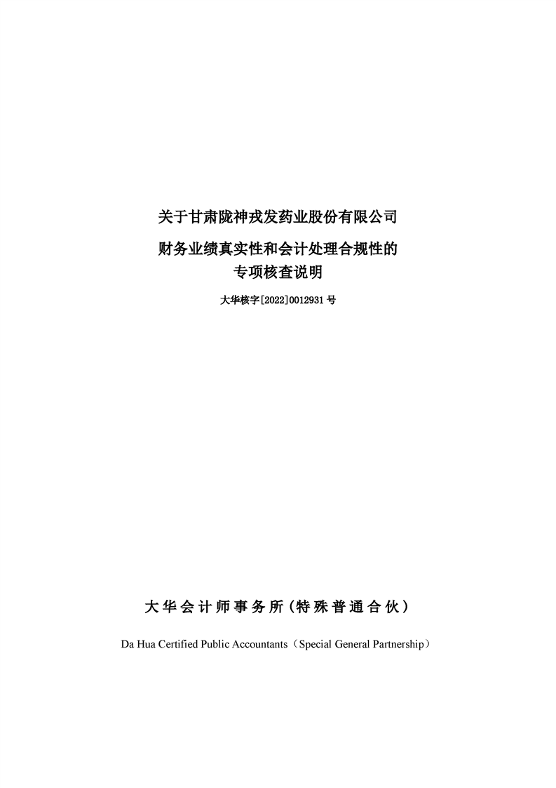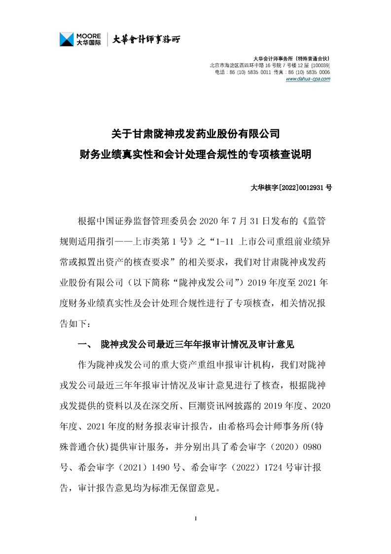 大華會(huì)計(jì)師事務(wù)所關(guān)于隴神戎發(fā)財(cái)務(wù)業(yè)績(jī)真實(shí)性和會(huì)計(jì)處理合規(guī)性的專(zhuān)項(xiàng)核查說(shuō)明