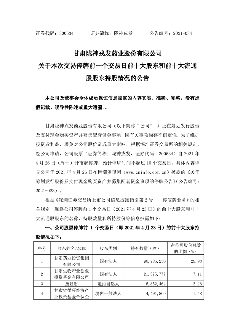 關(guān)于本次交易停牌前一交易日前十大股東和前十大流通股東持股情況的公告