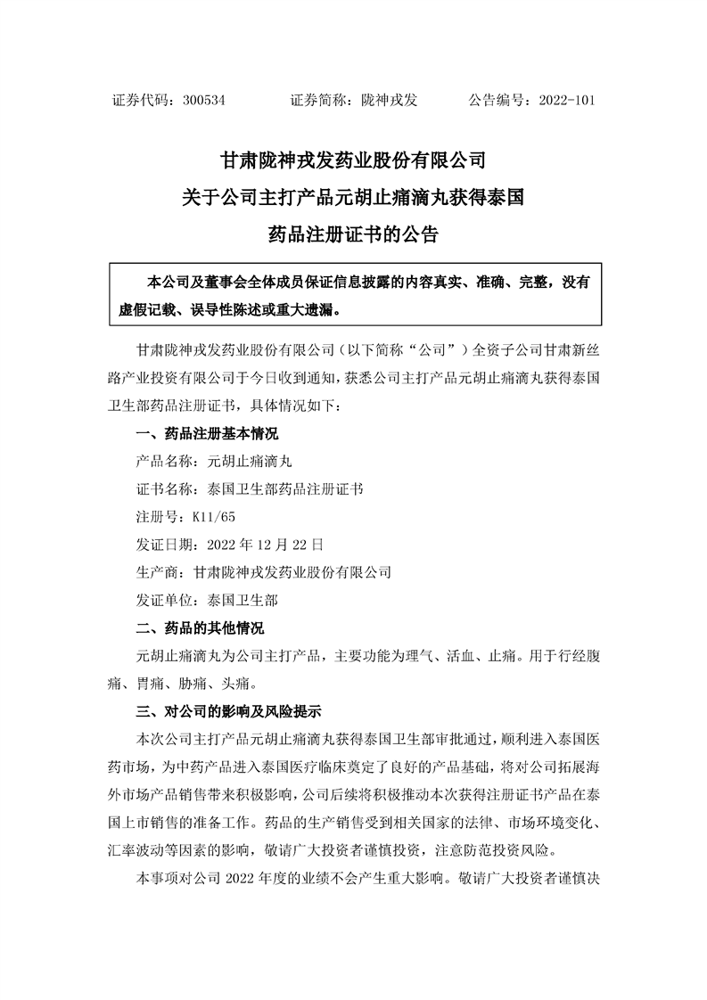關于公司主打產(chǎn)品元胡止痛滴丸獲得泰國藥品注冊證書的公告