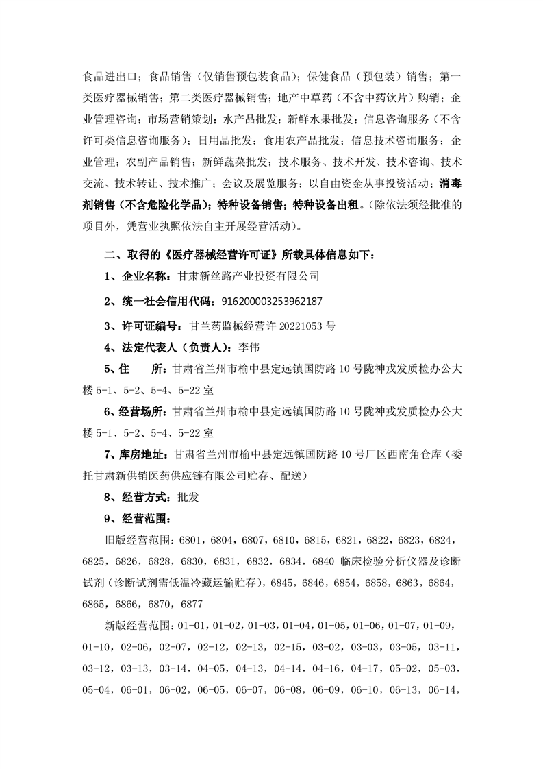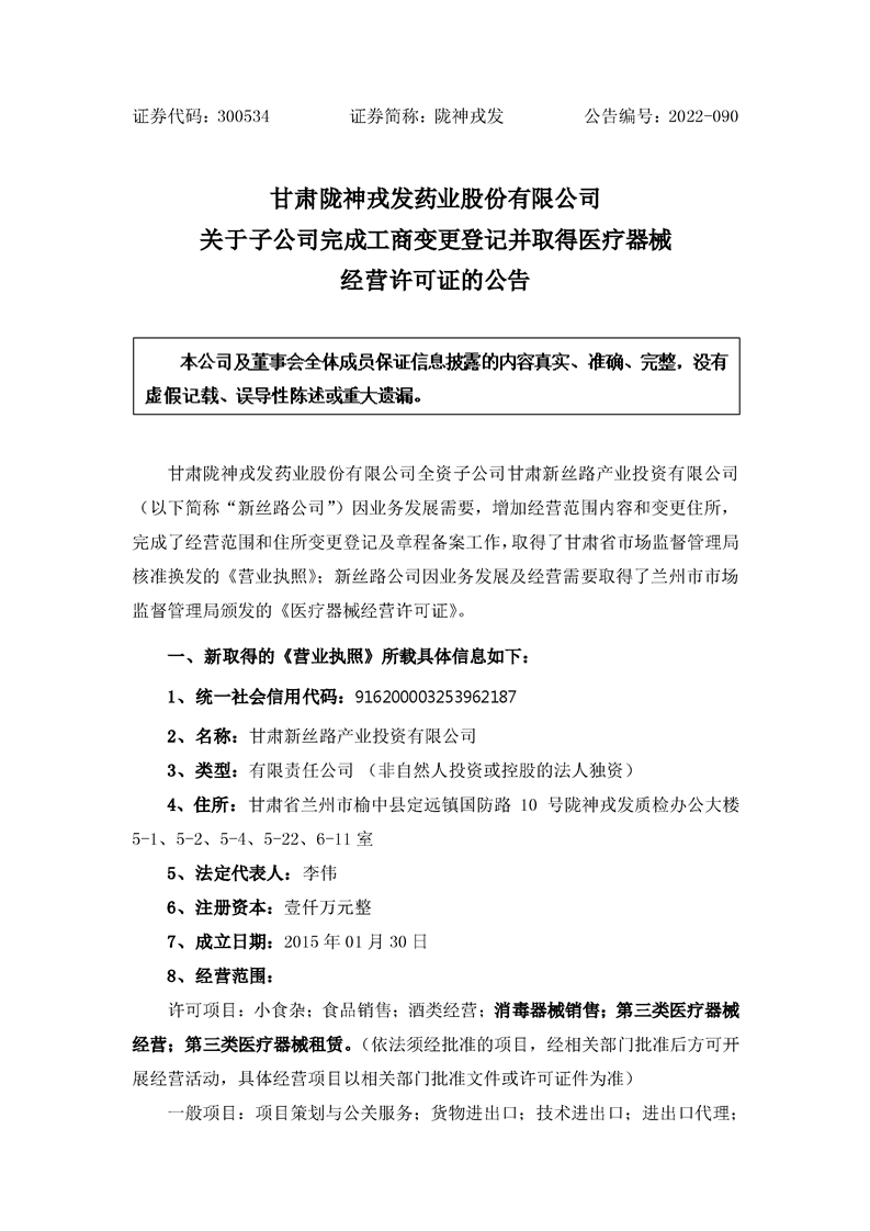 關于子公司完成工商變更登記并取得醫(yī)療器械經(jīng)營許可證的公告