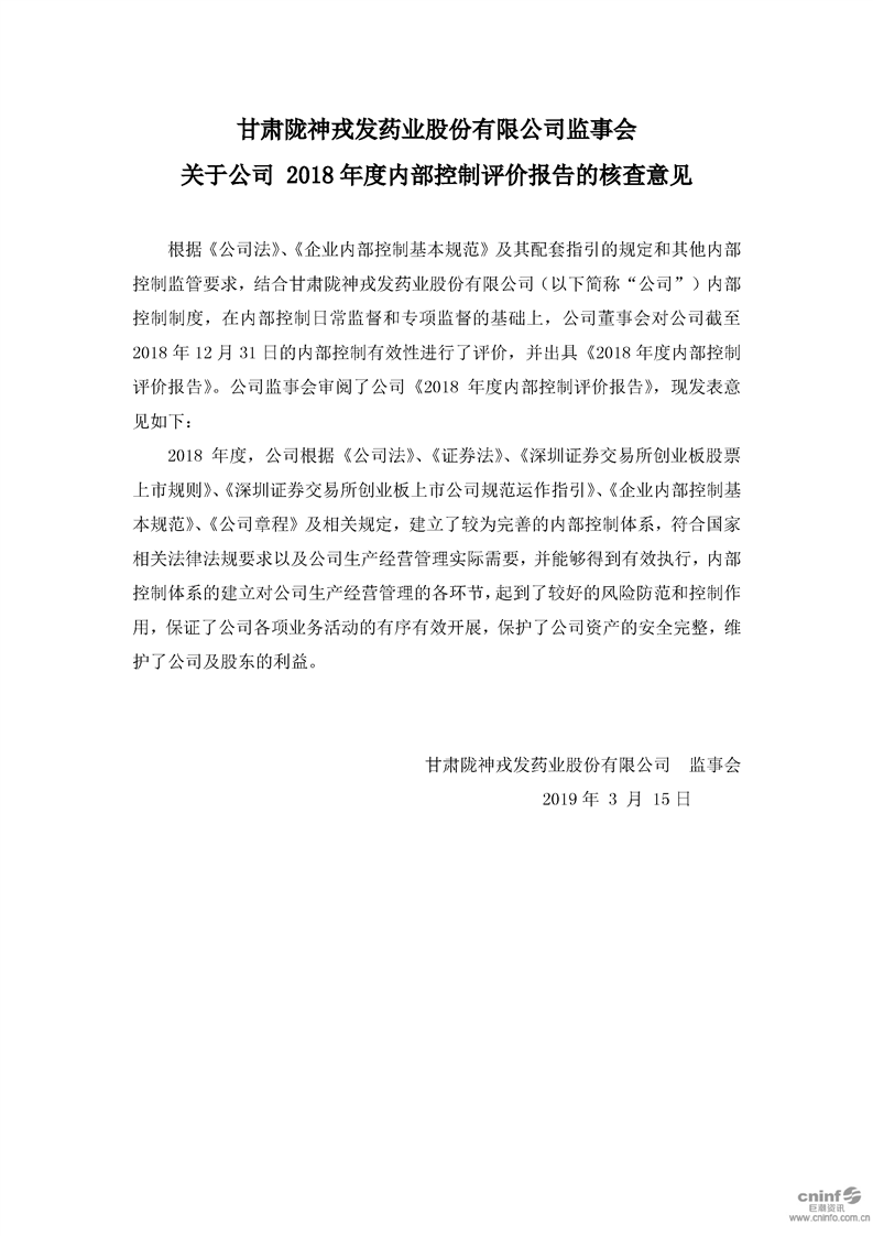 監(jiān)事會 關于公司 2018 年度內(nèi)部控制評價報告的核查意見