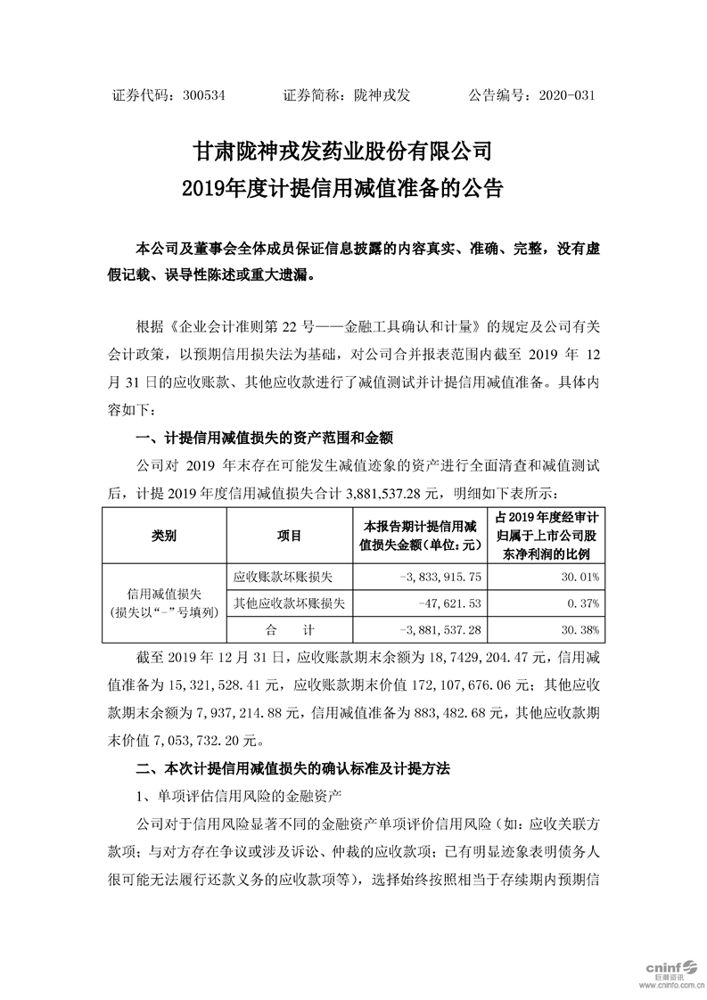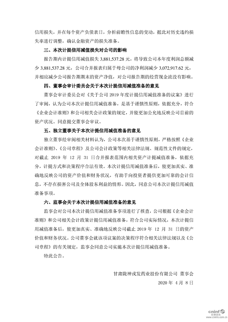 2019年度計提信用減值準(zhǔn)備的公告