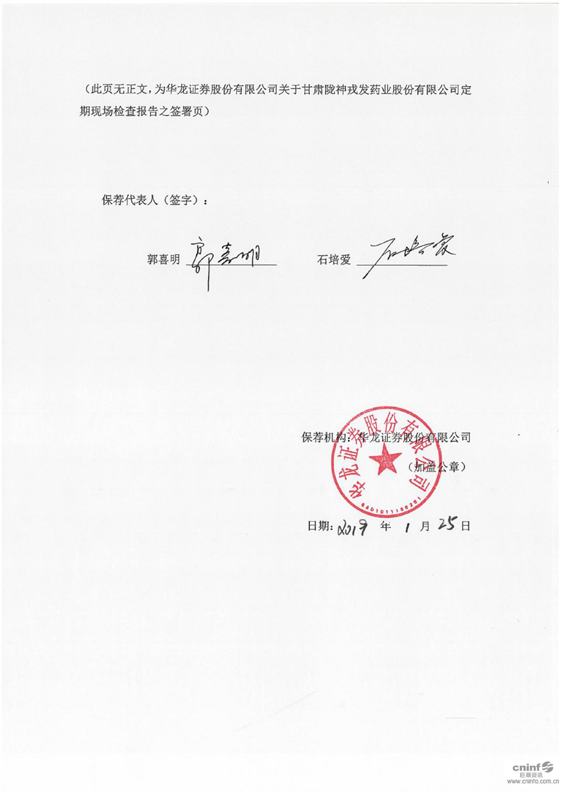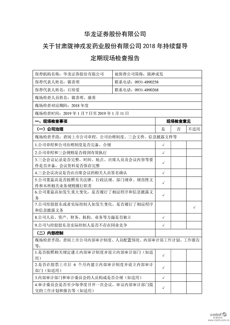 華龍證券股份有限公司關(guān)于甘肅隴神戎發(fā)藥業(yè)股份有限公司 2018 年持續(xù)督導(dǎo)定期現(xiàn)場檢查報(bào)告