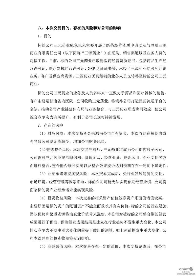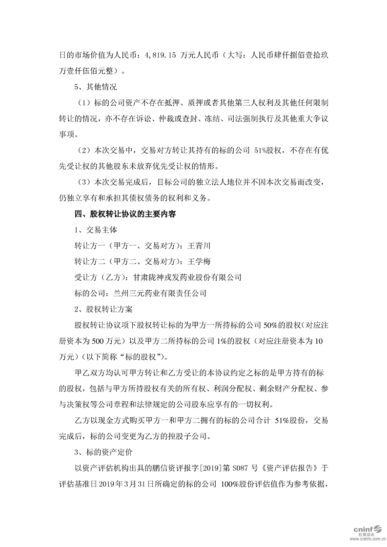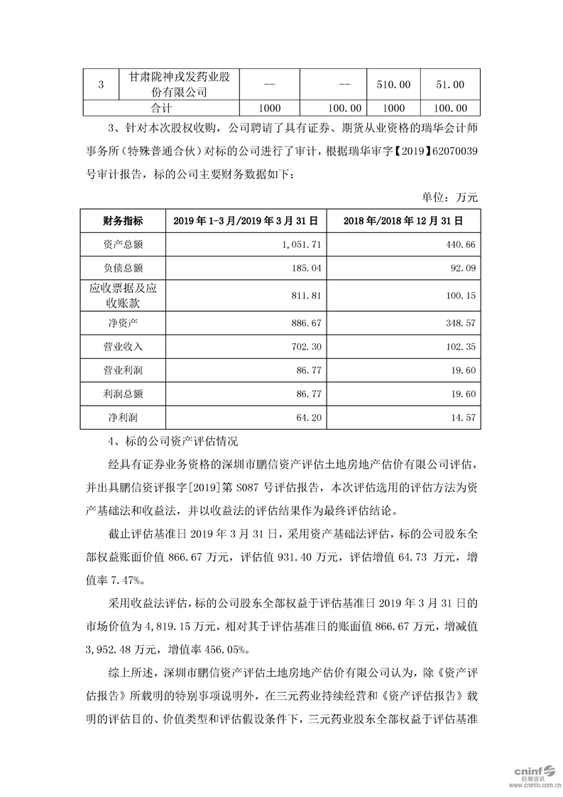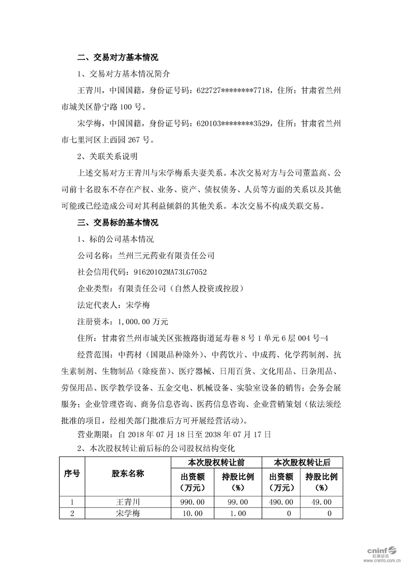 關(guān)于現(xiàn)金收購蘭州三元藥業(yè)有限責(zé)任公司51%股權(quán)的公告