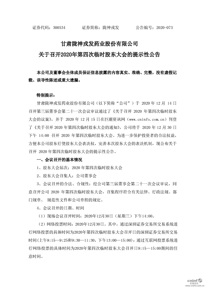 關(guān)于召開2020年第四次臨時(shí)股東大會(huì)的提示性公告