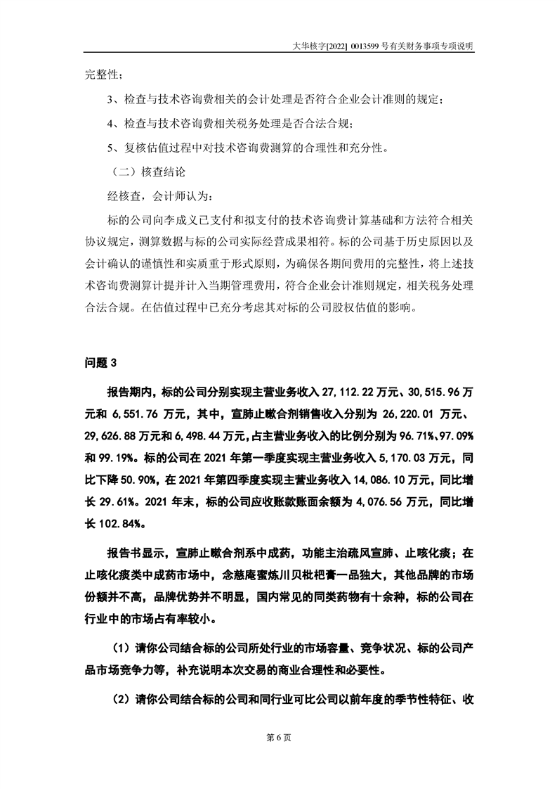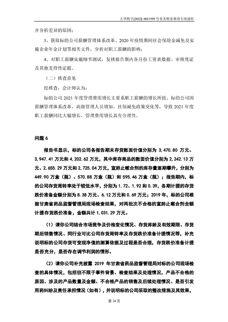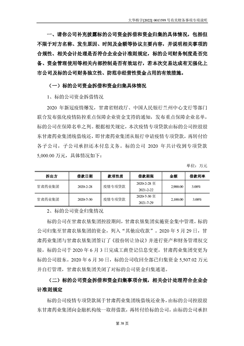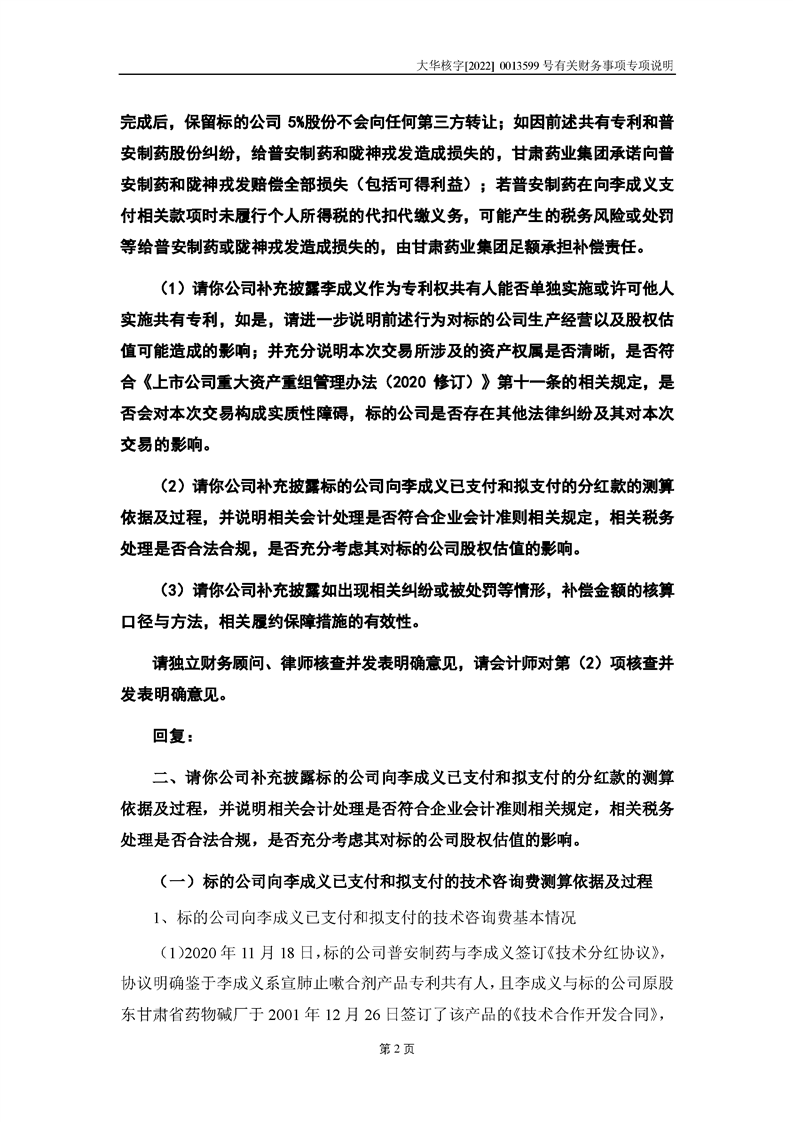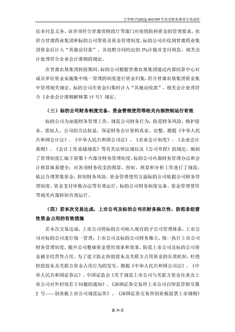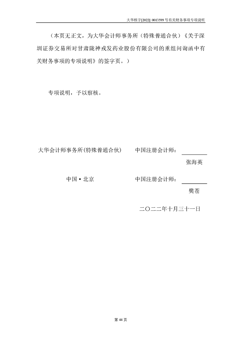 關(guān)于深圳證券交易所對甘肅隴神戎發(fā)藥業(yè)股份有限公司的重組問詢函中有關(guān)財務(wù)事項的專項說明大華核字[2022]0013599號