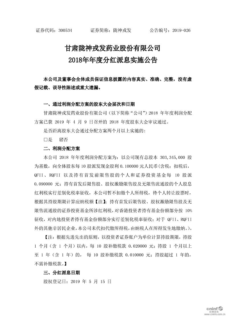 2018年年度分紅派息實施公告