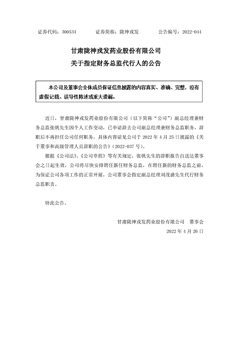 關(guān)于指定財(cái)務(wù)總監(jiān)代行人的公告