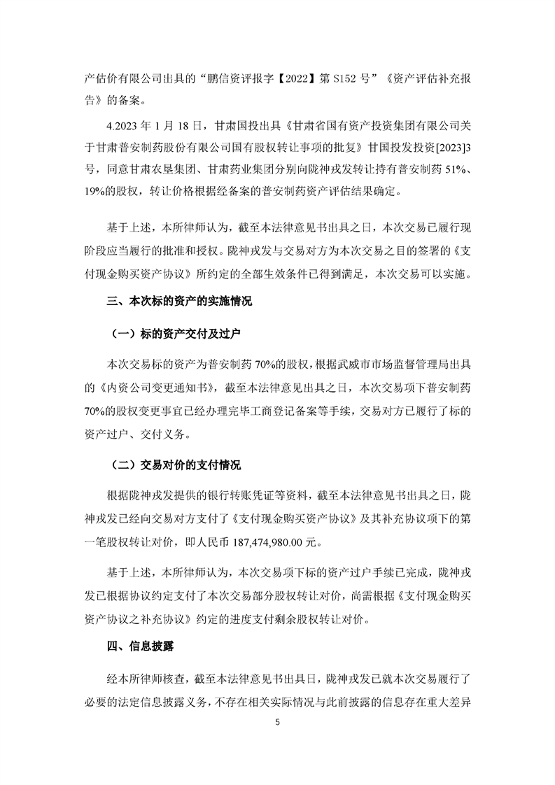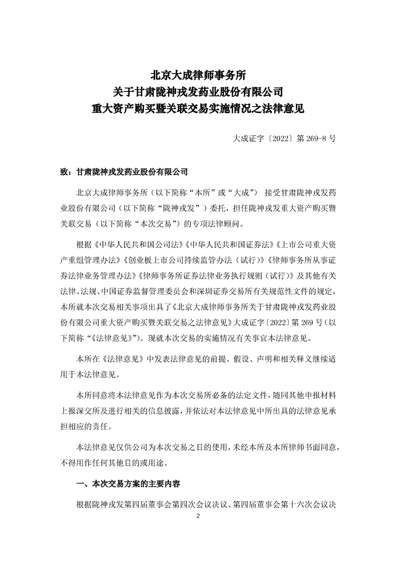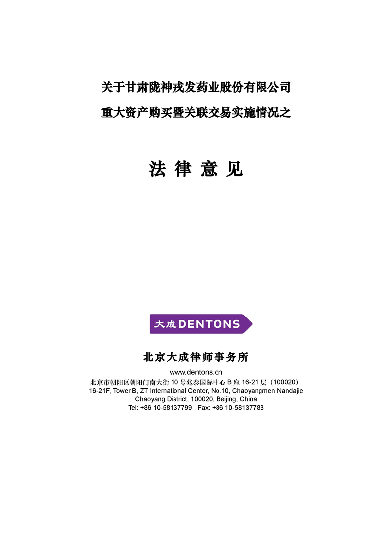 北京大成律師事務(wù)所關(guān)于甘肅隴神戎發(fā)藥業(yè)股份有限公司重大資產(chǎn)購買暨關(guān)聯(lián)交易之實(shí)施情況的法律意見