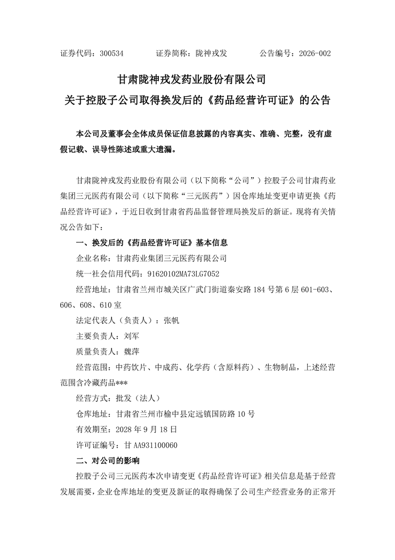 關于控股子公司取得換發(fā)后的《藥品經營許可證》的公告