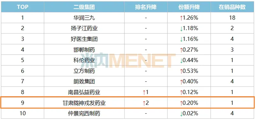 同時(shí),在2025年Q1中成藥胃藥(胃炎、潰瘍)二級(jí)集團(tuán)中,甘肅隴神戎發(fā)藥業(yè)排名上升2位至TOP9、銷(xiāo)售額增長(zhǎng)了8.95%。
