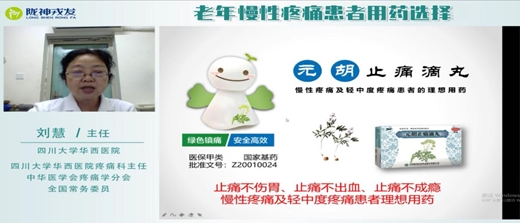19日下午正式開展線上“慢性疼痛與輕中度疼痛專家交流會”,首場直播邀請到中華醫(yī)學會疼痛學會分會全國常務委員、四川大學華西醫(yī)院疼痛科主任劉慧教授主講《老年慢性疼痛患者用藥選擇》,劉主任強調老年患者往往會存在肝腎功能不全等問題,目前廣泛使用的NSAIDs類藥物會導致消化道、心血管、肝腎功能的不良反應,而元胡止痛滴丸止痛不傷胃、止痛不出血、止痛不成癮的優(yōu)勢更適用于老年慢性疼痛。
