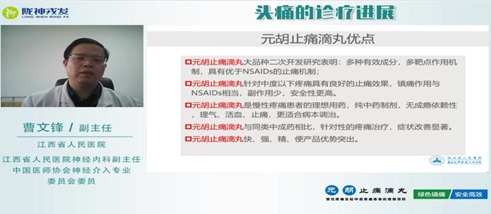 第三場交流會由中國醫(yī)師協(xié)會神經介入專業(yè)委員會委員、江西省人民醫(yī)院神經內科副主任曹文鋒教授主講《原發(fā)性頭疼的診療進展》,曹主任總結頭痛是最常見的臨床癥狀之一,慢性頭痛嚴重影響到人們生活質量,頭痛患者經常伴有抑郁癥、焦慮癥以及睡眠障礙等,臨床常用到的藥物副作用大,長期使用會導致藥物過度使用性頭痛,而元胡止痛滴丸含有多種有效成分,能夠多靶點聯(lián)合作用,可以調節(jié)疼痛機制的各種神經遞質,兼顧治療心理障礙,且副作用小。
