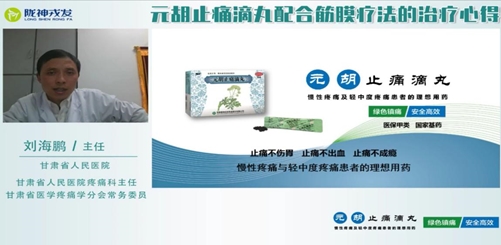 交流會第四場邀請到甘肅省醫(yī)學疼痛學會分會常務委員、甘肅省人民醫(yī)院疼痛科副主任劉海鵬教授,劉主任將臨床中筋膜療法與元胡止痛滴丸配合使用的治療方法及治療心得進行一一講解。