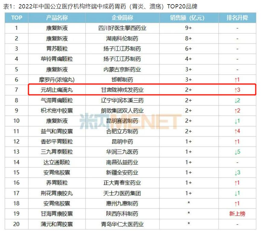 據(jù)統(tǒng)計,我國胃腸疾病患者有1.2億人,且發(fā)病率越來越高。據(jù)米內網最新數(shù)據(jù)顯示,2022年中國公立醫(yī)療機構終端中成藥胃藥(胃炎、潰瘍)銷售額保持在70億元水平。其中甘肅隴神戎發(fā)藥業(yè)的元胡止痛滴丸銷售額超過2億元,在2022年中國公立醫(yī)療機構終端中成藥胃藥(胃炎、潰瘍)TOP品牌排名第七。