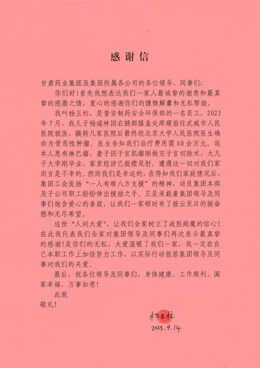 楊玉柱同志是普安公司的老職工,2019年經(jīng)診治患有淋巴瘤,先后在武威市人民醫(yī)院、蘭大二院進行治療,病情剛剛趨于穩(wěn)定,以為苦盡甘來之際,厄運卻再次降臨在楊師傅的家庭,兒子楊瑞林于2023年7月被確診為骨惡性腫瘤,治療費用高達60余萬元,這讓本就經(jīng)濟困難的一家人陷入困境。得知楊師傅一家的情況后,普安制藥工會多渠道尋求救助途徑,并在藥業(yè)集團及各所屬公司干部職工中發(fā)起了募捐倡議。募捐期間,全體干部職工們踴躍捐款,紛紛奉獻自己的愛心,為楊師傅一家募集了83044.01元的捐款。