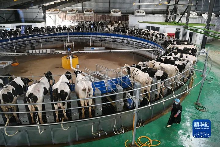 在武威市古浪縣生態(tài)奶牛產(chǎn)業(yè)園的一家企業(yè)牧場,工作人員在轉(zhuǎn)盤式擠奶機(jī)旁工作。