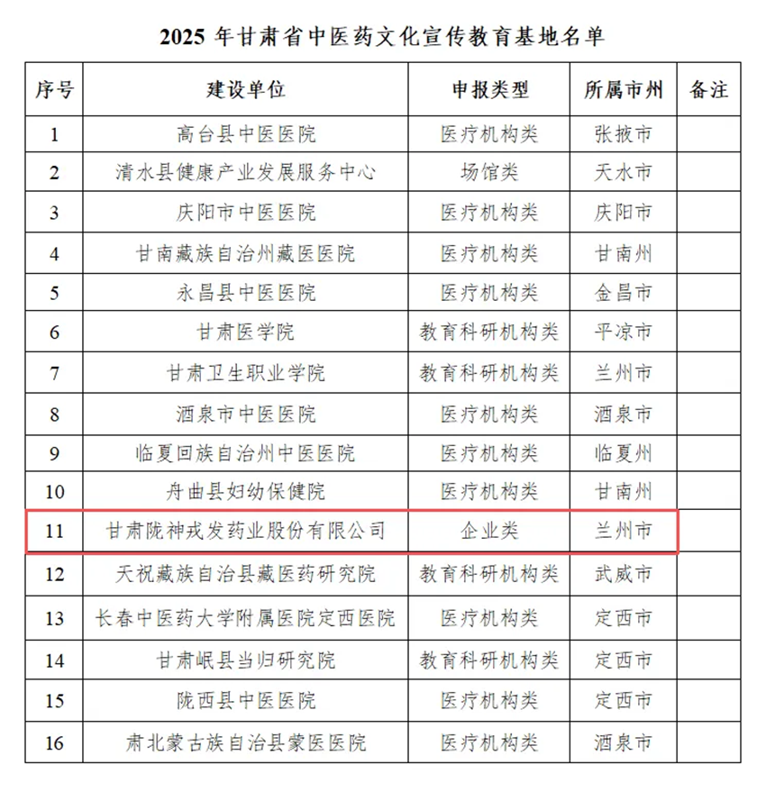 近日,甘肅省中醫(yī)藥管理局正式公布2025年省級中醫(yī)藥文化宣傳教育基地評審結(jié)果,甘肅隴神戎發(fā)藥業(yè)股份有限公司憑借在中醫(yī)藥文化傳承、科普宣傳教育及社會服務(wù)領(lǐng)域的突出表現(xiàn),成功入選“甘肅省中醫(yī)藥文化宣傳教育基地”。此次評審經(jīng)過嚴(yán)格的申報、推薦、審查及專家現(xiàn)場審核流程,旨在深入挖掘全省中醫(yī)藥文化資源,打造兼具文化傳播與公共服務(wù)功能的示范平臺,為全省中醫(yī)藥事業(yè)高質(zhì)量發(fā)展注入新動能。