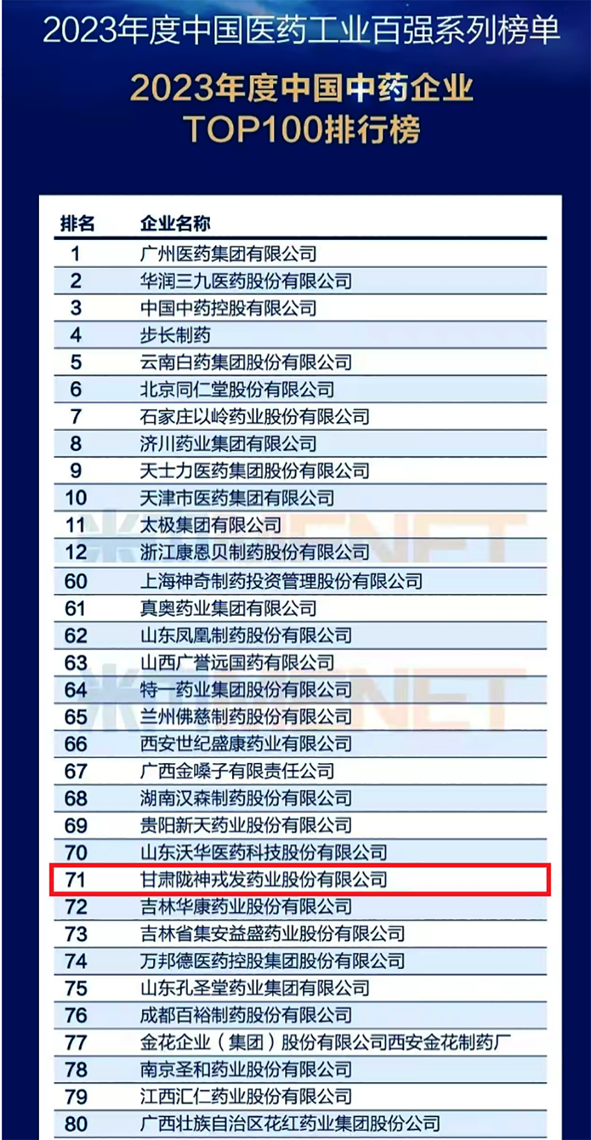 會(huì)上,“2023年度中國(guó)醫(yī)藥工業(yè)百?gòu)?qiáng)系列榜”重磅發(fā)布,共發(fā)布5大系列榜單和260家上榜企業(yè)。中國(guó)醫(yī)藥工業(yè)百?gòu)?qiáng)企業(yè)榜是國(guó)內(nèi)公認(rèn)的醫(yī)藥行業(yè)權(quán)威榜單,細(xì)分為“中國(guó)化藥企業(yè)TOP100排行榜”、“中國(guó)中藥企業(yè)TOP100排行榜”、“中國(guó)CXO企業(yè)TOP20排行榜”等5大子榜單,上榜企業(yè)是中國(guó)最具實(shí)力的醫(yī)藥工業(yè)企業(yè),代表國(guó)內(nèi)醫(yī)藥工業(yè)的發(fā)展水平,展示了中國(guó)醫(yī)藥工業(yè)百?gòu)?qiáng)企業(yè)的專業(yè)力和影響力。甘肅隴神戎發(fā)藥業(yè)股份有限公司首次成功入選“2023年度中國(guó)中藥企業(yè) TOP100 排行榜”,位列第71位。獲此殊榮的還有同為甘肅國(guó)投集團(tuán)控股的蘭州佛慈制藥股份有限公司。