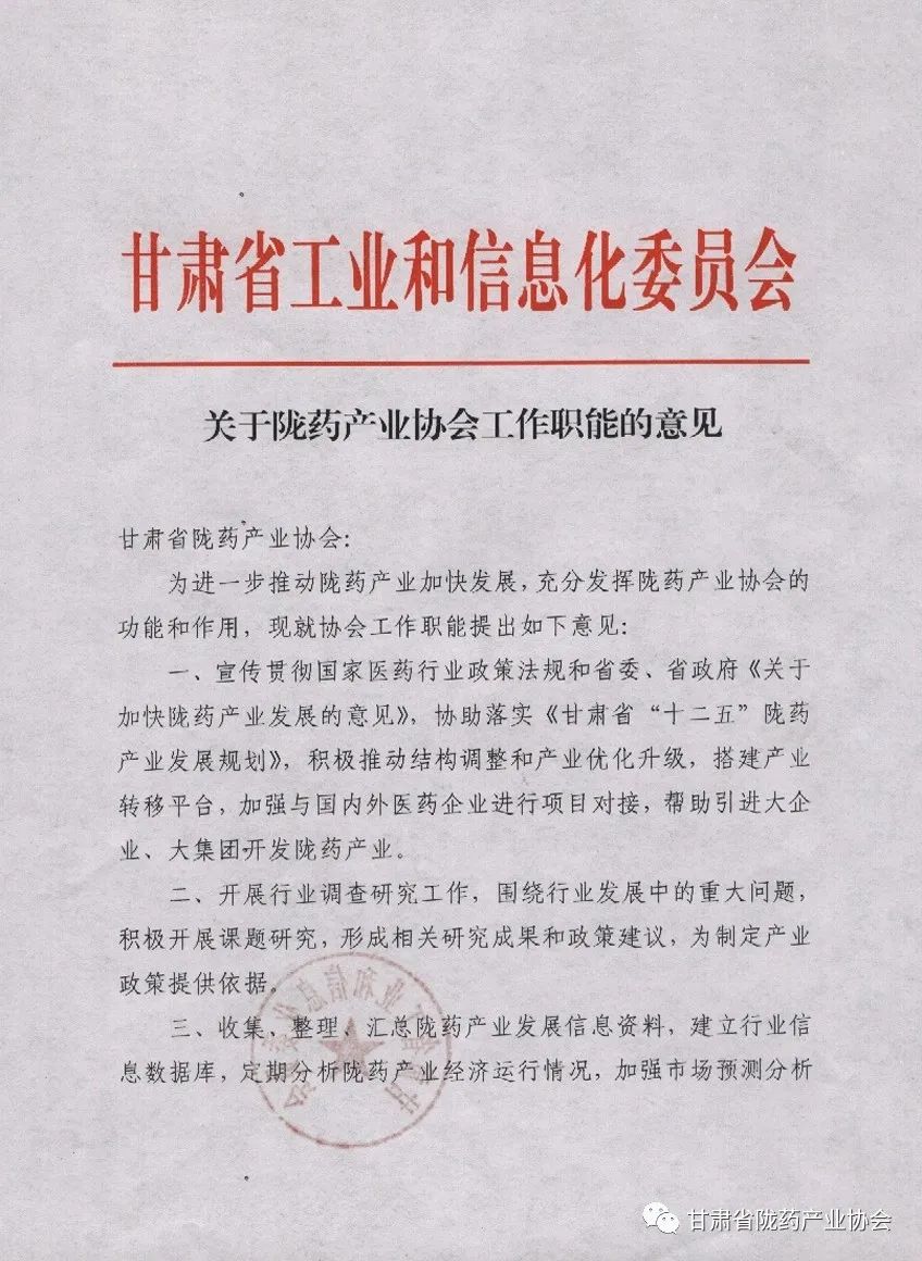 為了加快我省中藥材資源優(yōu)勢向經(jīng)濟(jì)優(yōu)勢轉(zhuǎn)化,培育壯大隴藥產(chǎn)業(yè),貫徹國務(wù)院辦公廳《關(guān)于進(jìn)一步支持甘肅經(jīng)濟(jì)社會發(fā)展的若干意見》(國辦【2010】129號)精神,省委省政府于2010年7月制定頒發(fā)了《關(guān)于加快隴藥產(chǎn)業(yè)發(fā)展的意見》,成立了推進(jìn)隴藥產(chǎn)業(yè)發(fā)展協(xié)調(diào)領(lǐng)導(dǎo)小組,科學(xué)布局,主打“隴”字招牌。在甘肅省工信委隴藥辦的主持下,由甘肅奇正實業(yè)集團(tuán)有限公司、蘭州生物制品研究所、蘭州佛慈制藥股份有限公司、蘭州大得利生化制藥(廠)有限公司及國藥控股甘肅有限公司為發(fā)起,67家甘肅醫(yī)藥企業(yè)加盟,歷時一年籌備,甘肅省隴藥產(chǎn)業(yè)協(xié)會正式成立。