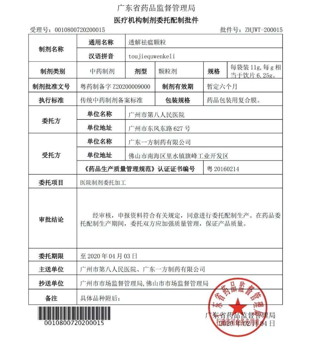 “肺炎一號方”制劑備案名稱為“透解祛瘟顆粒”,主治:疏風(fēng)透表、清熱解毒、益氣養(yǎng)陰,用于新型冠狀病毒感染的肺炎(輕癥)。