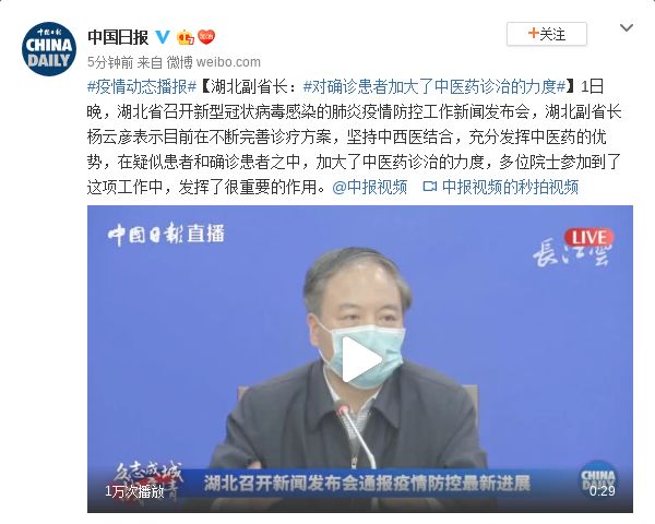 2月1日,湖北副省長楊云彥表示目前在不斷完善診療方案,堅持中西醫(yī)結(jié)合,充分發(fā)揮中醫(yī)藥的優(yōu)勢,在疑似患者和確診患者之中,加大了中醫(yī)藥診治的力度,多位院士參加到了這項工作中,發(fā)揮了很重要的作用。