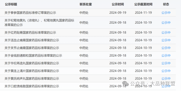 2024年9月29-30日,國家藥典委公示了19個中藥標(biāo)準(zhǔn)草案:黃連、艾葉、川芎、延胡索(元胡)、棕櫚、益智、柏子仁、大豆黃卷、北沙參、黃芩、防風(fēng)、白屈菜、天然冰片(右旋龍腦),冰片(合成龍腦),艾片(左旋龍腦);古漢養(yǎng)生精顆粒、古漢養(yǎng)生精口服液、古漢養(yǎng)生精片、心可舒片、消腫止痛酊。