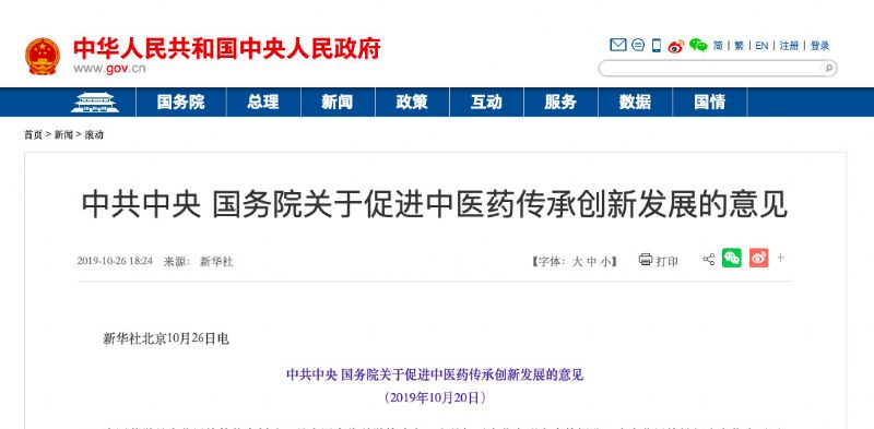 10月26日晚,國(guó)務(wù)院發(fā)布了《中共中央國(guó)務(wù)院關(guān)于促進(jìn)中醫(yī)藥傳承創(chuàng)新發(fā)展的意見(jiàn)》(以下簡(jiǎn)稱《意見(jiàn)》)。