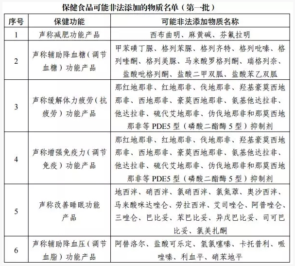 根據(jù)國家食品藥品監(jiān)督管理局《保健食品中可能非法添加的物質(zhì)名單(第一批)》(食藥監(jiān)辦;2012〕33號),保健食品可能非法添加的物質(zhì)名單如下: