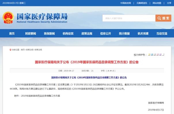 國家醫(yī)療保障局關(guān)于公布《2019年國家醫(yī)保藥品目錄調(diào)整工作方案》的公告