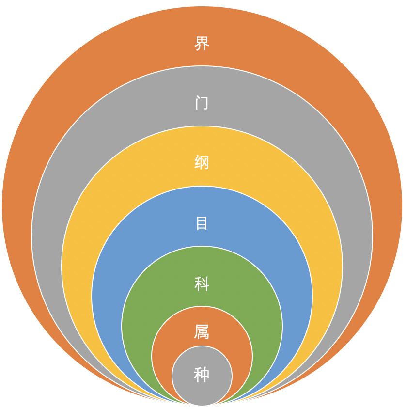 一般在生物學(xué)上,按照階元系統(tǒng)進(jìn)行分類,通常包括七個(gè)主要級(jí)別:界、門(mén)、綱、目、科、屬、種。種是基本單元。從界到種,范圍逐步縮小。